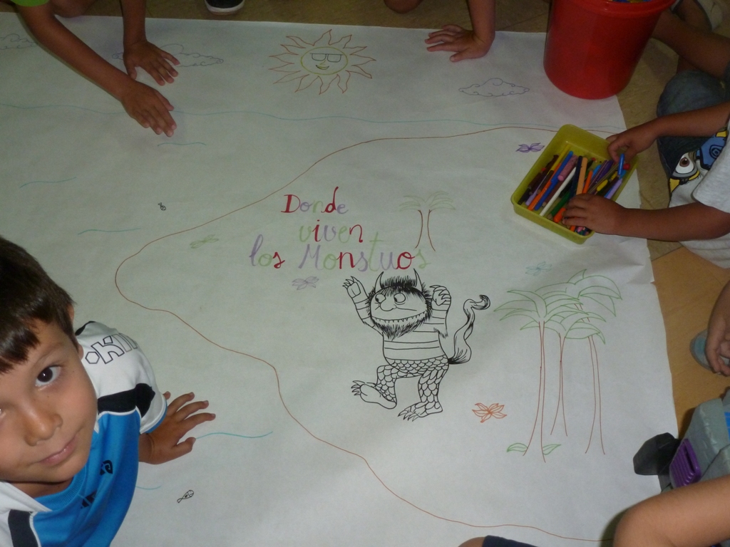 Después de un merecido almuerzo, hemos estado en el cole preparando un mural sobre los monstruos.
